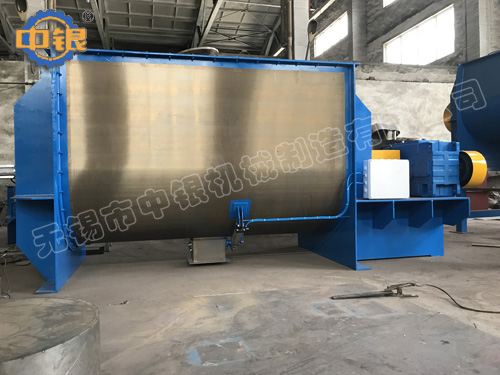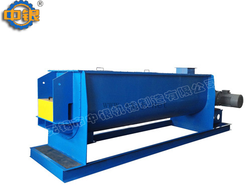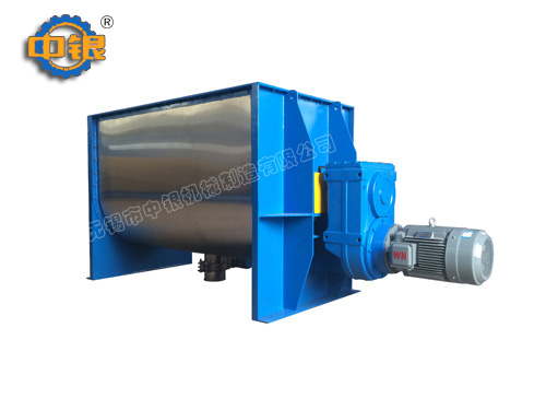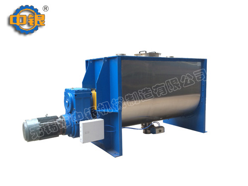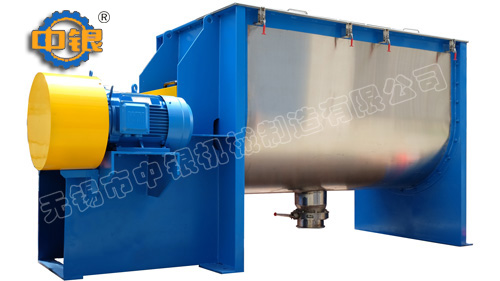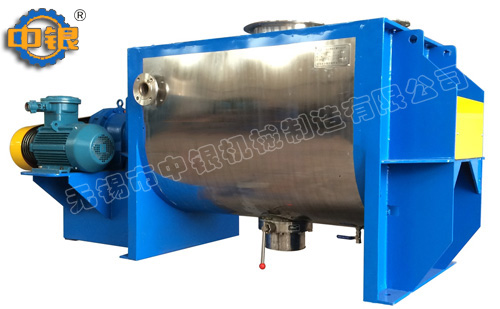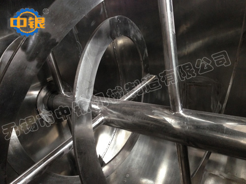 臥式螺帶混合機以高效、快速混合物料、由攪拌軸的螺旋帶運動下,使內(nèi)外螺旋帶在較大范圍內(nèi)翻動物料,內(nèi)螺旋帶將物料向兩側(cè)運動,外螺旋帶將物料由兩側(cè)向內(nèi)運動,使物料來回滲混,另部分物料被螺旋帶推動下,沒軸向徑向運動,從而形成對流循環(huán)。由于上述運動的攪拌,物料在較短時間內(nèi)獲得快速均勻混合。